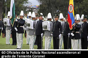 Bogotá, D.C. Con la presencia del Jefe de la Cartera de Defensa, doctor Juan Carlos Pinzón Bueno, del señor General Rodolfo Palomino López, Director General de la Policía Nacional, representantes del cuerpo diplomático, autoridades civiles, militares y eclesiásticas; el Gobierno Nacional asciende al grado de Teniente Coronel.La ceremonia se realiza desde las 8:30 am en el campo de paradas de la Escuela de Cadetes General Francisco de Paula Santander, ubicada en la calle 44 sur No. 45 A-15, Barrio Muzú - Bogotá.Luego de estudiar las hojas de vida y ejecutorias de los oficiales, el Gobierno otorgó el nuevo grado como un reconocimiento a su trayectoria en la permanente defensa de la seguridad y tranquilidad de los colombianos.Se les impuso el nuevo grado de Teniente Coronel, a 60 Mayores, Asimismo, serán ascendidos con el grado de Mayor 12 Capitanes, al grado de capitán 250 Tenientes e impondrán el grado de Teniente a 272 Subtenientes. La Policía Nacional en nombre de todos sus integrantes expresa gratitud a los uniformados por sus desempeños profesionales al servicio de la comunidad, asimismo extiende un fraternal saludo de felicitación a sus familias .