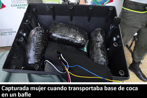 Florencia. El hecho se registró en un puesto de control ubicado en la vía Florencia - Neiva, donde le fueron hallados a esta persona tres paquetes con base de coca ocultos en el interior de un bafle. Al desarmar el elemento, uniformados hallaron el alucinógeno envuelto en cinta con peso de cuatro kilos, por lo que esta mujer fue puesta a disposición de la autoridad competente indiciada por el delito de tráfico, fabricación o porte de estupefacientes. La Policía Nacional continúa desplegando operativos para contrarrestar la comercialización de estupefacientes en los corredores viales de este importante Departamento, por lo que invita a la ciudadanía a denunciar a través de la línea 123.