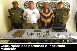 Valledupar. En la acción se decomisaron 217 cartuchos de diferentes calibres y uniformes del Ejercito Nacional. Labores de investigación permitieron ubicar una residencia en el barrio San Martín, hallando prendas de Uso Privativo de las Fuerzas Militares en poder de dos sujetos quienes intentaron huir siendo capturados posteriormente. La acción se registró en coordinación con la Fiscalía 7 local URI, a través de una diligencia de registro y allanamiento, donde se capturaron a estos sujetos sindicados del delito de Fabricación, Tráfico, o Porte de Armas de Fuego o Municiones y Uso de Prendas e Insignias de Uso Privativo de la Fuerzas Militares. En el operativo se encontraron 179 cartuchos calibre 5.56 mm, seis cartuchos calibre 38 mm, dos cartuchos calibre 0.50, diez cartuchos calibre 32 mm, siete cartuchos calibre 9mm, tres cartuchos calibre 380 mm, dos cartuchos calibre 7.65 mm, tres cartuchos calibre 47 (ak), cinco cartuchos de fogueo, dos vainillas de granadas calibre 40 mm y 28 espoletas de granadas de mano. Así mismo se les incautó material de intendencia, una batería, tres camisas camufladas, tres pantalones dril camuflados, una field jacket camuflado, un saco térmico color verde con el logotipo del Ejercito, tres suéteres color verde camuflados, cuatro goleanas color verde camufladas, dos pañoletas color verde, una hamaca de color verde camuflada, un impermeable camuflado, tres pares de botas militares, tres morrales de asalto color verde camuflados, tres ligas color verde camuflados, una riñonera para morral, un chaleco arnés color verde camuflado y un computador portátil. Es de anotar que en el interior de un chaleco arnés, se halló documentación y un listado de personas con sus respectivos alias, al parecer integrantes de la organización delictiva.