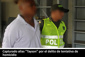 Cartagena D. T. y C. En desarrollo de la Estrategia Institucional de Convivencia y Seguridad Ciudadana, Unidades de Vigilancia Comunitaria por Cuadrantes efectuaron la captura y judicialización de alias ¿Tayson¿ de 23 años de edad.El procedimiento se llevó a cabo mediante patrullajes de verificación en el barrio Olaya Herrera, donde fue interceptado este hombre quien al momento de solicitarle una requisa accionó un arma de fuego calibre 9mm, dejando herido a uno de los uniformados, asimismo le fue incautada una granada de fragmentación.El capturado, el arma de fuego, la munición y la granada incautada fueron dejadas a disposición de la Fiscalía por el delito de tentativa de homicidio y porte ilegal de armas.