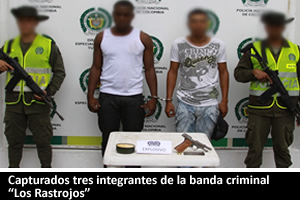 Tumaco, Nariño. En desarrollo de la Estrategia contra las Bandas Criminales la Policía viene adelantando diferentes planes operativos y preventivos con el fin de individualizar, identificar, capturar y judicializar a integrantes de la banda criminal ¿Los Rastrojos¿. Gracias a información suministrada por miembros de la red de cooperantes y mediante labores de registro y control en el barrio Panamá municipio de Tumaco, personal policial desarrolló la operación ¿Troya Pacifico II¿, donde fueron capturados alías el ¿Tuerto¿ de 21 años de edad y alías ¿El Mudo¿ de 23 años de edad, a quienes se les incautó una pistola calibre 9mm con un proveedor, dos cartuchos para la misma y un artefacto explosivo tipo mina anti persona. De la misma forma fue capturado alías ¿Yuber¿, quien era solicitado por el delito de homicidio agravado, quien según labores investigativas era el segundo jefe de sicarios de ¿Los Rastrojos¿ en los barrios Panamá y Buenos Aires. Alías ¿El Tuerto¿ y ¿El Mudo¿, tenían como función cumplir órdenes como las de ultimar a miembros de las RAT y otros de la misma organización, delinquían en los barrios de Panamá y Buenos Aires. A los capturados se les atribuyen un sin número de homicidios ocurridos en los años 2011 y 2012 y estarían recibiendo instrucciones de alias ¿Mi Niño¿ presunto cabecilla de dicha organización en zona urbana del municipio de Tumaco. Los sujetos y los elementos incautados fueron dejados a disposición de la autoridad competente por los delitos antes mencionados.