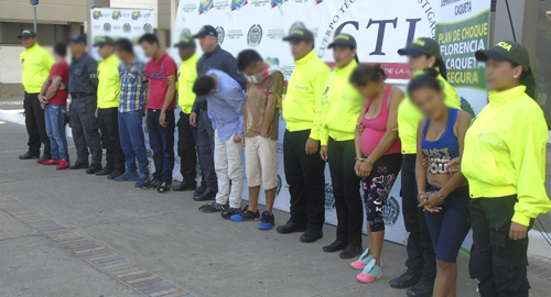 Durante la aplicación de la estrategia Institucional denominada "Plan Choque Contra el Hurto en todas sus modalidades", en las últimas horas la Policía Nacional gracias al trabajo de sus hombres y mujeres, adscritos a la Seccional de Investigación criminal (SIJIN), logró la desarticulación de la banda delincuencial denominada La Décima, capturando a sus integrantes, presuntos responsables de más de 25 hurtos en diferentes modalidades en esta localidad.La Policía Nacional continúa su ofensiva contra el hurto en todas sus modalidades aplicando diferentes estrategias institucionales en los diferentes barrios de la ciudad, mediante labores disuasivas como identificación de vehículos y personas en los puestos de control, también a través de seguimientos minuciosos y labores investigativas que arrojaron la captura de alias Ome, alias Payaso, alias Japones, alias Jimmy, alias Morocho, alias Mirllan y alias Morocha entre 22 y 29 años de edad.Según las investigaciones e información de inteligencia, estas personas presuntamente se dedicaban a la comisión de delitos como hurto calificado y agravado, tráfico, fabricación o porte de estupefacientes, lesiones personales y daño en bien ajeno; los cuales presentan un prontuario de 24 noticias criminales por los delitos antes mencionados, y se le atribuyen más de 30 hurtos en la modalidad de atraco, cosquilleo.Los capturados son requeridos por las autoridades judiciales mediante órdenes de captura por los delitos de Hurto Calificado con Circunstancias de Agravación y Concierto para Delinquir.
