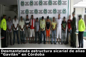 Bogotá, D.C. Con la captura de 15 integrantes de esa organización, la Policía logró el esclarecimiento de una docena de asesinatos y frustró al menos cinco más. Este resultado obedece a la captura por unidades de la Dirección de Investigación Criminal e Interpol (DIJIN), de 15 integrantes de la principal estructura sicarial de alias "Gavilán", cabecilla de "Los Urabeños" en esa región, y por quien el Presidente de la República, Juan Manuel Santos, ofreció hasta 500 millones de pesos de recompensa tras comprobarse su responsabilidad como determinador en la muerte de dos jóvenes en zona rural de San Bernardo del Viento. Las 13 diligencias de registro, allanamiento y captura efectuadas por la Policía Nacional, se llevaron a cabo en Bogotá y los municipios cordobeses de Cereté, Sahagún y Ciénaga de Oro, donde entre otros fue detenido alias "Rogelio", jefe de la organización y lugarteniente inmediato de "Gavilán". Dentro de la investigación, que incluyó entrevistas, inspecciones judiciales, verificaciones de información, vigilancias, seguimientos, reconocimientos fotográficos y testimonios, la DIJIN comprobó la participación directa de los implicados en el crimen de un estudiante del SENAy un joven de la Universidad de Cartagena, quienes fueron interceptados por pistoleros cuando se desplazaban en motocicleta hacia su lugar de residencia en la vereda La Carolina de la localidad de Cereté. Entre los crímenes atribuidos a estos delincuentes también aparece la masacre de cuatro personas, tres de ellas de una misma familia en la finca La Sorpresa del municipio antes mencionado, quienes fueron judicializados por homicidio y concierto para delinquir agravado con fines de cometer homicidio. Cabe recordar que alias "Gavilán", hizo parte de las Autodefensas Unidas de Colombia, donde delinquió al lado de Salvatore Mancuso. Posteriormente se desmovilizó en el año 2005, pero terminó aliado con los hermanos Darío Antonio y Juan de Dios Úsuga David, herederos de alias "Don Mario", hasta que fue empoderado como cabecilla de "Los Urabeños" en Córdoba.