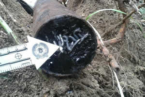 Pitalito, Huila. En cumplimiento a la estrategia de intervención integral contra el terrorismo la Policía Nacional halló una caleta con material explosivo perteneciente al parecer al frente tercero Oswaldo Patiño de las Farc. La operación adelantada a la altura de la vereda Costa Rica, vía que del municipio de Pitalito conduce al centro poblado de San Adolfo y liderada por miembros de la Unidad básica de Inteligencia del municipio de Garzón en coordinación con unidades de Antiexplosivos de la Seccional de Investigación Criminal, (SIJIN) de la Policía, hallan el material explosivos el cual se presume estaba acondicionado para atentar contra integrantes de la fuerza pública. El materia explosivo estaría en una caleta cubierta con plástico que contenía dos artefactos de fabricación artesanal armados y estarían listos para lanzar con rampa, el elemento hallado tendría aproximadamente 10 kilos de explosivos compuestos de amonal mezcla de nitrato de con aluminio el cual fue activado de manera controlada por expertos de Antiexplosivos del Departamento de Policía Huila La operación "Fenix" desarrollada por la Policía Nacional, permitió una vez más frustrar el accionar terrorista de las Farc, quienes pretendían seguir actuando contra la vida y la integridad física de la Fuerza Pública y la tranquilidad de los demás habitantes en el departamento huilense.