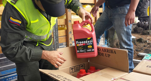 Personal adscrito a la Seccional de Tránsito y Transporte hicieron el hallazgo de 180 tarros de ácido sulfúrico y 271 galones, al parecer tendrían como fin ser utilizados en el procesamiento de estupefacientes. Los hechos se registraron en el sitio conocido como la herradura, en momentos en que los uniformados realizaban labores de solicitud de antecedentes, requisa a personas y controles a los vehículos que transitan por esta importante vía del departamento, de tal manera que al hacer el pare al vehículo de transporte de encomiendas, hallando 30 cajas las cuales en su interior contenían el químico.De inmediato los profesionales de policía incautaron estos elementos por considerarse dentro del delito de tráfico de sustancias para el procesamiento de narcóticos.La Institución a través del Departamento de Policía Quindío mantiene los planes operativos y preventivos, dirigidos a evitar la comisión de cualquier tipo de delito. De igual manera se mantienen las actividades encaminadas a desarticular las bandas dedicadas al narcotráfico en esta región y el resto del país.