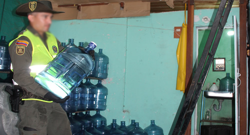 Nuestras unidades adscritas al grupo de Protección Ambiental y Ecológica en coordinación con el Instituto Nacional de vigilancia de Medicamentos y Alimentos, desmanteló en el barrio La Concordia, una fábrica clandestina para el procesamiento y embotellamiento del preciado líquido.Luego de que recibiéramos una denuncia por parte de la comunidad, desarrollamos un operativo que permitió la incautación de 80 envases plásticos con una capacidad de 20 litros cada uno, 96 tapas plásticas, 800 etiquetas, así mismo logramos la incautación de 5 litros de hipoclorito de sodio y 5 litros de alcohol industrial utilizados para el procesamiento del agua.De igual forma destruimos un sistema primario para el tratamiento del agua, el cual estaba instalado en un baño sin ofrecer las condiciones mínimas higiénico-sanitarias requeridas para el tratamiento y embotellamiento de agua, durante el procedimiento policial no se registraron capturas, debido a que las personas que se dedicaban a cometer el ilícito no se encontraban en el lugar, los elementos incautados fueron dejados a disposición de la Secretaria de Salud de Bucaramanga.