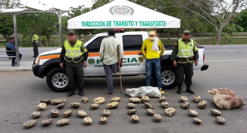 Mediante puestos de control y requisa, unidades de la seccional de Tránsito y Transporte se incautaron de 77 hicoteas y lograron la captura de dos personas. El procedimiento se efectuó en la vía que de Cereté conduce a Montería, al interceptar a estos sujetos quienes se movilizaban en un bus de servicio público. Al descubrir las especies y su deplorable estado, estas personas fueron capturadas por el delito de Aprovechamiento de los Recursos Naturales Renovables por lo cual fueron dejadas a disposición de la autoridad competente.Es de anotar, que esta especie es comercializada en temporada de Semana Santa, ya que se convierte en un plato típico.Con la incautación de estos animales, la Policía contribuye con su preservación.