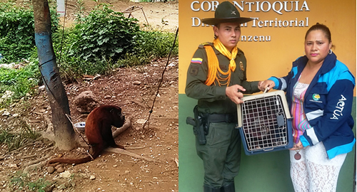 Un Mono Aullador, Alouatta Ceniculus, fue rescatado por parte de la Policía de Carabineros de Caucasia, luego de que lo vieran amarrado a un árbol de un solar en una vivienda del corregimiento de Buenos Aires, en el municipio de Zaragoza. Esta especie tiene hábitos diurnos y arbóreos. Al no atender el llamado de la policía, los uniformados procedieron con el rescate del animal, avaluado con un valor ecológico de 5,2 millones de pesos y el cual en el mercado negro puede ser adquirido por $300.000. El mono aullador se alimenta de frutas maduras y hojas tiernas y complementa su dieta con flores, raíces y semillas. Se realiza el rescate en aplicación al artículo 248 del decreto ley 2811 de 1974, la especie en mención se encuentra en regular estado, se deja a disposición de la autoridad ambiental competente Corantioquia.En cuanto los animales silvestres, la Policía Ambiental se encarga de protegerlos y luego dejarlos a disposición de la autoridad ambiental regional que decide si los dejan en custodia en un zoológico o son devueltos a su hábitat natural.