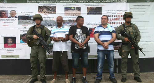 Hombres jungla y comandos especiales de la Policía Nacional, llegaron a una de las áreas de retaguardia de Dairo Antonio Úsuga David, alias "Otoniel " en las que recientemente pasó algunos días evadiendo la contundencia de la operación Agamenón. Integrantes del esquema de seguridad del narcotraficante se enfrentaron a los uniformados, dos de ellos fueron abatidos y de paso recuperado material de intendencia, dos fusiles, una pistola, proveedore y memorias USB con información de la recomposición del "Clan Úsuga". Los dos neutralizados en la operación cumplida en la vereda Altos de Nueva Fe, en zona rural de Turbo (Antioquia), fueron identificados con los alias de "Pescado" y "Manyoma". Los cuerpos fueron trasladados a la sede de Medicina Legal, mientras los investigadores de la Policía Nacional verifican la información encontrada que pone en evidencia los últimos movimientos de alias "Otoniel" y algunos de sus nuevos contactos.En otro procedimiento de asalto y allanamiento realizado en Turbo (Antioquia), fueron capturadas tres personas, solicitadas mediante circular roja con fines de extradición por la Corte del Distrito Sur de la Florida, por los delitos federales de conspiración para distribuir cocaína. Con estas detenciones y otra realizada hace cinco días en Medellín, de alias "El Ojón", quedó desarticulada una estructura narcotraficante al servicio del Clan Úsuga. Para lograr evadir los controles de las autoridades, esta organización utilizaba distintas formas de envío; camuflaba la droga en embarcaciones, lanchas rápidas y barcos que cubrían las rutas a Europa. También acudían a contactos en Panamá, Costa Rica, Nicaragua, Honduras y México, donde recibían la sustancia estupefaciente para moverla a Estados Unidos.A esta estructura narcotraficante, ya se le había propinado varios golpes en Colombia y el extranjero. En septiembre del 2011, en el Golfo de Urabá fue interceptada una lancha con dos toneladas y media de cocaína. Posteriormente en La Raya (Honduras) las autoridades de ese país se incautaron de tonelada y media de cocaína que movilizaban en una lancha rápida.