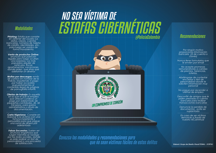 Diferentes planes pueden encontrarse casi que a diario para los fervientes compradores quienes emplean las herramientas tecnológicas para acceder a la gran gama de ofertas y oportunidades de descuento, todas están a su orden en la Internet para hacer compras sin salir de casa, sin embargo es de tener en cuenta que también hay otros peligrosos detrás de la red, que sin necesidad de estar en la calle estan siguiendo los pasos a los navegantes digitales.De ahí que al hacer sus compras en la red ponga en práctica parte de nuestro propósito el cual consiste en entregarle algunas normas básicas para así evitar que los ciberdelincuentes ejecuten sus maniobras informáticas criminales.Lea con atención y siga las siguientes recomendaciones:Analizar por completo la página que detalla el producto y si se le surge alguna inquietud preguntar al vendedor.Utilice los buscadores para hacer una pequeña indagación por la empresa que está vendiendo los productos, una opinión de su confiabilidad no está demás.Tome atenta nota de los medios de comunicación que tiene el vendedor, email, url de la página, redes sociales y números de contacto.Si va a realizar alguna compra por redes sociales, revise como medida de orientación los comentarios que han se han hecho con anterioridad otras personas.Tenga en cuenta la importancia de realizar la compra a una empresa debidamente constituida, que se puede verificar a través de NIT.Revise la reputación del vendedor, algunos portales web dedicados a la venta de productos tienen este calificativo.Aunque suene un poco repetitivo es importante tener en cuenta que para realizar cualquier transferencia a través de la banca online, verificar que la dirección web del portal empiece con "https" y no solo "http".No proporcione información de su tarjeta de crédito vía telefónica o en páginas de dudosa reputación.Actualmente se permite la compra de productos a través de la web sin la necesidad de poseer una tarjeta de crédito, existe la integración de otros sistemas electrónicos de entidades bancarias que le permiten hacer consignaciones y transferencias, es muy importante que la página en la cual adquiere el producto tenga integrado el medio de pago.No olvide contar siempre con nosotros, nuestro compromiso también está presente en el ciberespacio; acuda también a nuestros servicios digitales a través de las cuentas @PoliciaColombia y @CaiVirtual estaremos atentos a brindarles orientación y recomendaciones de seguridad con el fin de minimizar el accionar criminal por parte de los ciberdelincuentes.Así mismo acuda al cuadrante virtual a través de #CuadranteVirtual o telefónicamente a través de la línea 123. Expertos del Centro Cibernético Policial estarán a su servicio.No sea víctima de estafas cibernéticas, encuentre aquí las modalidades y recomedaciones….#CiberPapaya CIBERPAPAYA.jpg