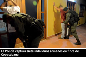 Medellín. La Policía Nacional en el marco del programa presidencial ¿Seguridad ciudadana, política nacional para la prosperidad democrática¿, capturó a siete hombres momentos en que se disponían a hurtar los electrodomésticos de una finca en el municipio de Copacabana en el norte del área Metropolitana.Una llamada al 123 permitió la reacción del grupo de operaciones especiales GOES, los cuales fueron recibidos con disparos y quienes capturaron a estas personas hallándoles cuatro pistolas, cuatro proveedores y 40 cartuchos de diferentes calibres.Cabe destacar que estos individuos se movilizaban en tres vehículos con placas tapadas con medias veladas, que posteriormente fueron dejados a disposición de la autoridad competente.