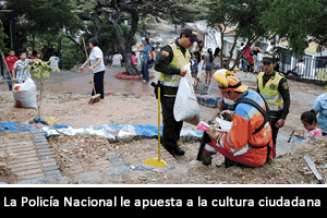 San José de Cúcuta. En el marco de la política nacional de seguridad y convivencia ciudadana del Gobierno Nacional, en la ciudad de Cúcuta se adelantan acciones de acercamiento con la comunidad, buscando fortalecer la cultura ciudadana. La iniciativa institucional liderada por personal de la Policía de Turismo en esta oportunidad llegó hasta el barrio Circunvalación de la comuna 10, donde en conjunto con integrantes de la Junta de Acción Comunal, estudiantes del Colegio Santa Cecilia y funcionarios de una empresa de aseo capitalina, se realizó una jornada de limpieza, ornamentación y recuperación del parque Colsace.El equipo interinstitucional motivado en la recuperación de este sitio de encuentro y darle una nueva, recolectó basuras que propios y extraños han depositado en este lugar a través de los días, afectando su imagen y buen ambiente. Así mismo podaron y deshojaron los árboles que por años han acompañado a transeúntes y residentes en este periférico barrio de la capital.Entre tanto, los más pequeños hicieron su aporte artístico a la actividad, plasmando en las piedras con ayuda de pinceles y sus manos diferentes figuras que hacen parte de su imaginación infantil, logrando con ello dar color e inocencia a los muros que soportan el pendiente terrero. Para la finalizar el evento, se realizó un mural donde todos los asistentes contribuyeron en plasmar con letras e imágenes la esencia de la campaña ¿Quiero a mi ciudad, valoro mi patrimonio¿, que seguirá llegando a los diferentes parques de la ciudad.