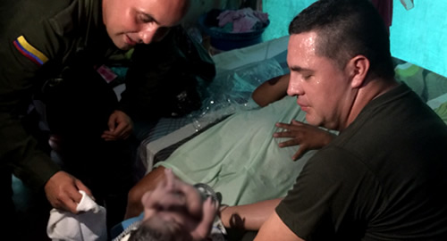En medio de la confusión, los dolores del parto, el hospital lejano y el no contar con medios de transporte el esposo un poco asustado realizó la llamada a la línea de emergencia 123 de La policía Nacional, quien sin pensarlo sería la encargada de traer a su hijo al mundo.Eran las 2:40 de la tarde y la temperatura aun en aumento, esto hacia un poco más difícil este alegre momento, pero los dos policiales de inmediato respondieron al llamado un señor Teniente Diego Mora y el señor Subintendente Carlos Andrés Calderón, que llegaron lo más pronto a la comunidad del Porvenir, donde residen integrantes de la etnia Puinabe, nativos de la región en una humilde vivienda; donde los estaba esperando el padre del niño. El infante ya estaba preparado para llegar al mundo, sin mayor instrucción los uniformados quienes en su carrera institucional nunca habían recibido a un bebé, se las ingenian para hacerlo y de inmediato ayudan a la madre a realizar el trabajo de parto, así logrando dar a luz.El pequeño varón llega en perfectas condiciones; entre llantos y risas sus padres agradecen en todo momento a los policiales por hacer posible el nacimiento de su primogénito.El trabajo difícil ya había pasado, solo tenían que cortar el cordón umbilical, pero no tenían el conocimiento necesario para hacerlo, entonces desde la central de radios otro patrullero les indicaba la forma correcta de anudarlo, los uniformados atentos seguían al pie de la letra cada una de las indicaciones, mientras en camino llegaba la ayuda de los expertos. Un gran equipo se desplazó de inmediato a ese lugar y fueron testigos del mejor regalo del mundo que pudo haber tenido un Policía.En honor a uno de los policiales que ayudaron en el trabajo de parto como recompensa el progenitor llevará con orgullo el nombre de uno de estos héroes y una historia en su corazón para contar eternamente.