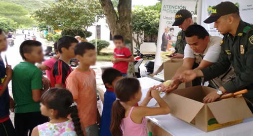 ​Con el propósito de desestimular la violencia y promover comunidades seguras y en paz, la Policía lideró en este municipio la estrategia "Plan Desarme", invitando a la niñez y la adolescencia a hacer entrega de juguetes bélicos y armas blancas.A esta actividad se vincularon alrededor de 90 niños, niñas y adolescentes, siendo una oportunidad propicia para afianzar los vínculos y estrechar los lazos de amistad, expresando la voluntad institucional en contribuir al sano crecimiento de la niñez.Durante la jornada, fueron entregados 75 juguetes bélicos y 15 armas blancas, elementos que fueron recepcionados por uniformados y un delegado de la Alcaldía Municipal; a cambio, cada infante recibió un pollito, como insignia por su compromiso.De igual forma, se realizaron actividades lúdicas y recreativas, llevando un día lleno de alegría y juegos a esta importante población del Departamento.