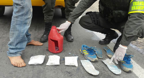 Gracias a informaciones suministradas por integrantes de la red de aliados para la prosperidad se interceptó un vehículo de servicio público en la vía que de Sardinata conduce a Cúcuta, en este se movilizaba un hombre que traía un recipiente plástico aparentemente lleno de leche y dentro de él, las unidades policiales hallaron tres bolsas plásticas con una sustancia que al practicársele la Prueba de Identificación Preliminar Homologada PIPH resultó ser bazuco. También se observó que esta persona llevaba los zapatos rotos sin cordones pero con las suelas nuevas, y a solicitar una inspección a los mismos se hallaron en cada uno una bolsa plástica en forma de plantilla llena del estupefaciente.El capturado de 35 años de edad, presuntamente llevaba la sustancia estupefaciente con destino a la capital Nortesantandereana, en donde sería comercializada al menudeo en por lo menos 2 mil dosis. Finalmente fue puesto a disposición de la Fiscalía General de la Nación por el presunto delito de tráfico, fabricación o porte de estupefacientes.