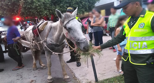 Un vehículo de tracción animal fue objeto de una inmovilización y su propietario sancionado con un comparendo ambiental teniendo en cuenta se movilizaba por un sector de circulación prohibida, además que el equino presentaba algunos maltratos.De esta manera la Policía Ambiental y Ecológica rinde tributo al decreto 000-444 inmovilizando el denominado carro de mula y dejándolo junto con el equino en custodia en un parqueadero de la ciudad.Los policías pertenecientes a esta especialidad, hacen un llamado a la comunidad para que no transiten con estos vehículos por lugares prohibidos y que además tenga a bien el buen trato contra estas especies.Denuncie cualquier hecho de maltrato animal a la línea 123, juntos trabajamos para garantizarle el bienestar a estos bellos animales.