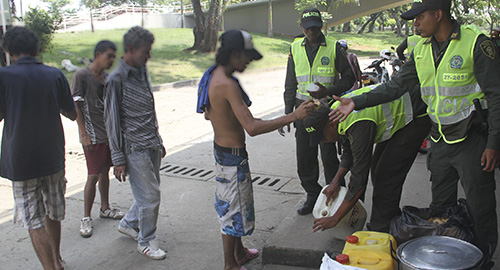 Santiago de Cali. La Policía realizo una jornada lúdica para los habitantes de la calle con baño y alimentos.Con el ánimo de estrechar lazos de amistad, colaboración y civismo, La Policía realizo una jornada cívico policial con habitantes de la calle.En este día estas personas asistieron al coliseo del pueblo disfrutando donde se pudieron asear tener ropa limpia, desayuno y almuerzo al igual que charlas sobre los daños de la droga y temas de superaciónLa institución con estas actividades pretende sensibilizar a estas personas para que vean la vida diferente y logren superar las dificultades y poder salir de las calles.