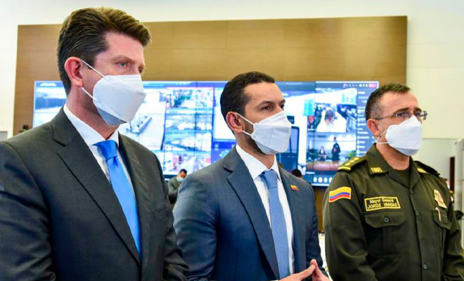 Declaración conjunta del Director General de la Policía Nacional, general Jorge Luis Vargas Valencia, el ministro del Interior, Daniel Palacios, y el ministro de Defensa, Diego Molano Aponte. Esta declaración se emite desde el Puesto de Mando Unificado (PMU) de la Dirección General de la Policía Nacional para el seguimiento de las manifestaciones convocadas este 28 de abril. En el mensaje se hace un recuento de las situaciones más relevantes hasta el momento, el dispositivo de seguridad y las recomendaciones del Gobierno de cara a esta jornada.