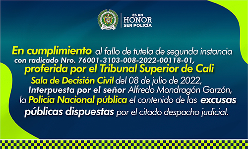 En cumplimiento al fallo de tutela de segunda instancia con radicado Nro. 76001-3103-008-2022-00118-01, proferido por el Tribunal Superior de Cali – Sala de Decisión Civil del 08 de julio de 2022, interpuesta por el señor ALFREDO MONDRAGÓN GARZÓN, la Policía Nacional pública el contenido de las...